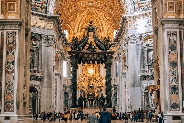 Then you will enter through the massive bronze doors and the awe-inspiring Nave. Admire the colossal statues, intricate mosaics, and the breathtaking Baldachin designed by Gian Lorenzo Bernini.